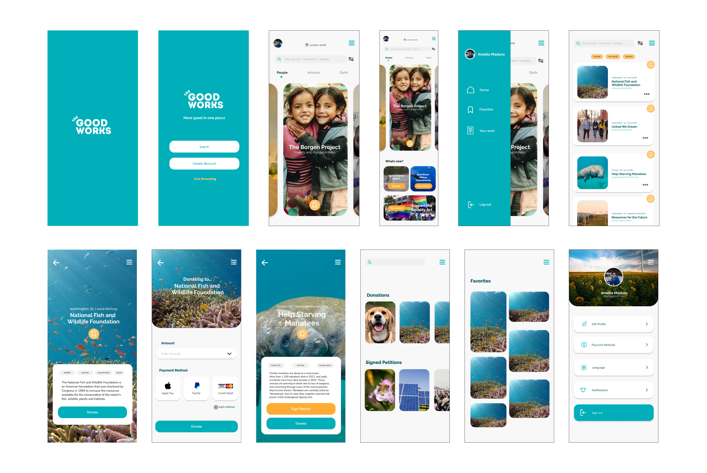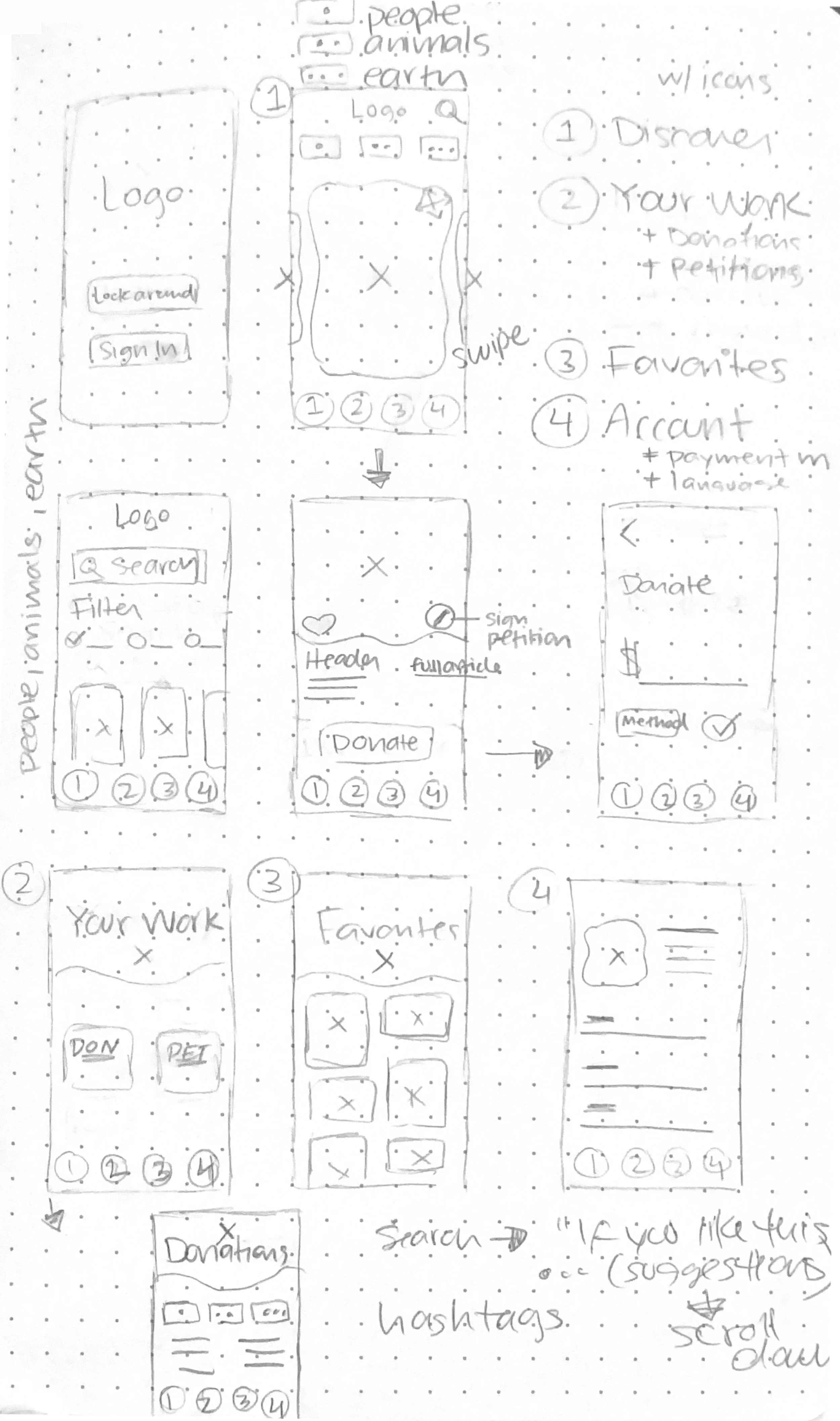 The goal was to create an image-heavy app that communicates information quickly and effectively. The design aimed to streamline the user experience, minimizing steps between discovering a cause and taking action, whether by signing a petition or making a donation.