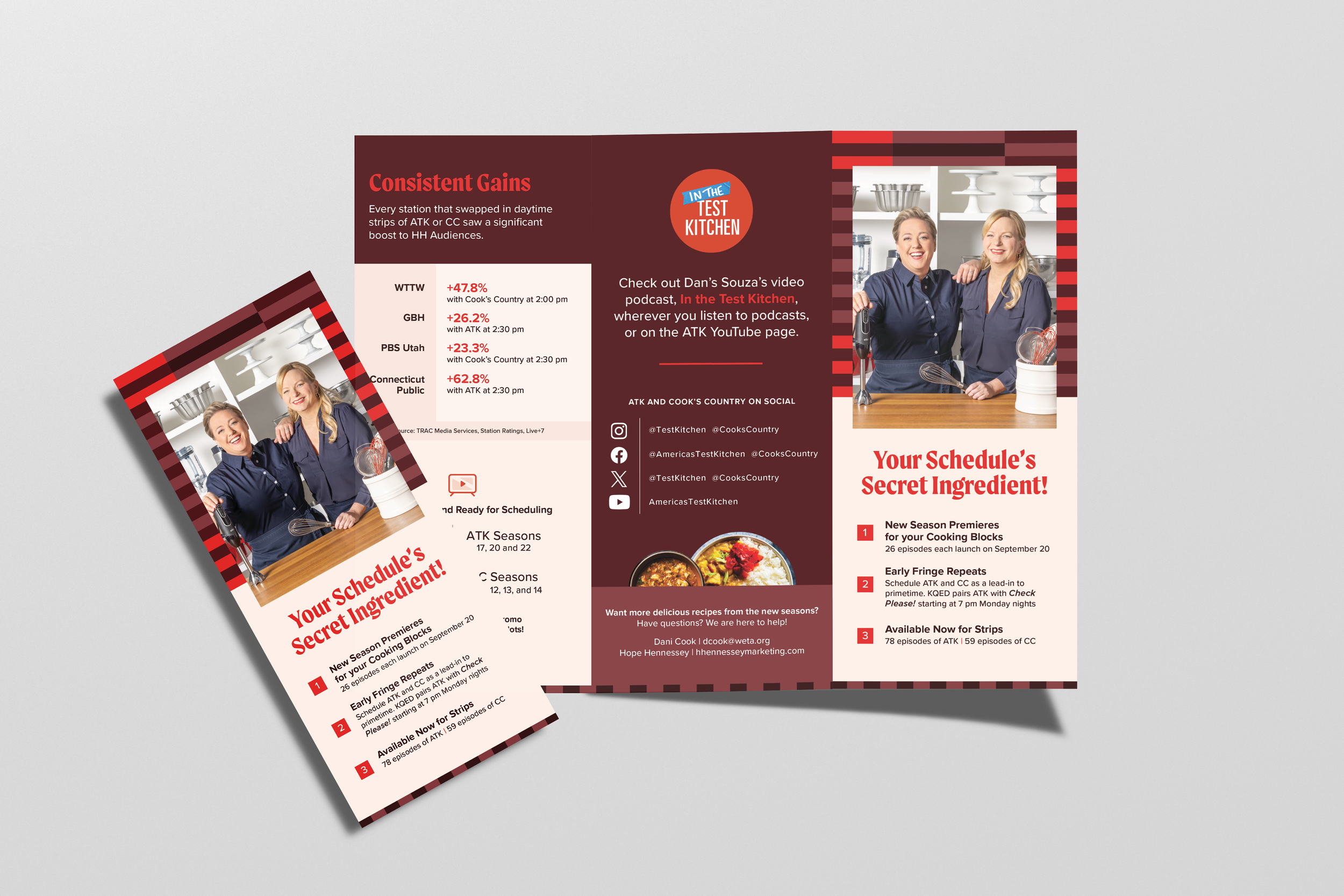 A tri-fold brochure to highlight the scheduling options for series Americaβs Test Kitchen and Cookβs Country.