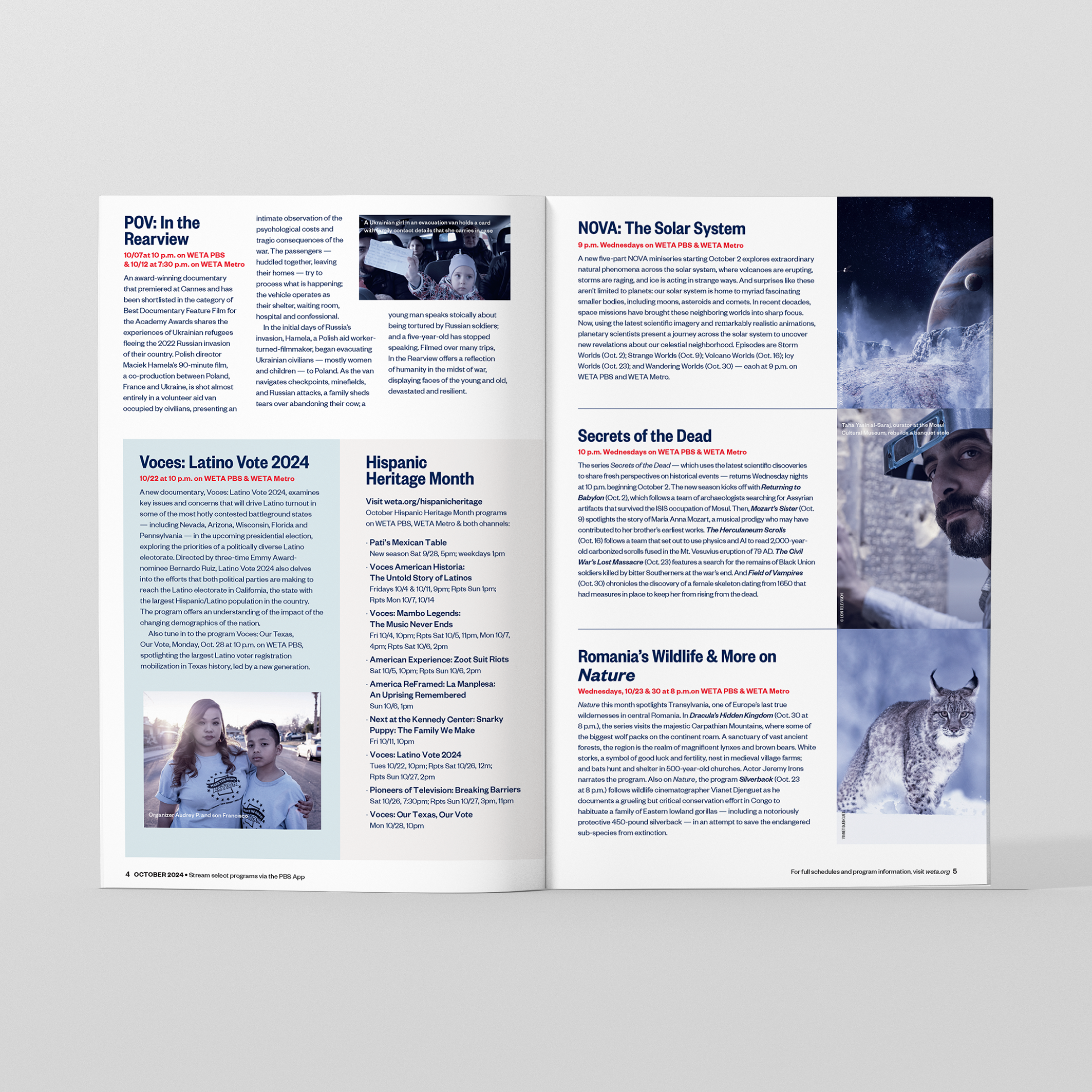 A three-color concept for the WETA Magazine, their monthly on-air program guide. The goal was to modernize the design while keeping it aligned with WETAβs brand (colors, typography, etc.) and making sure itβs engaging and readable, especially for their