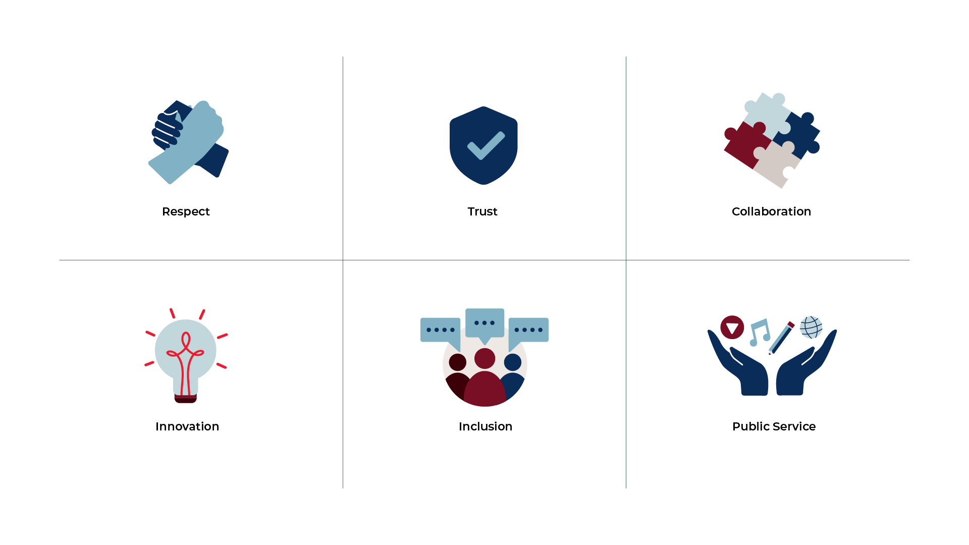WETA’s Core Values: Respect, Trust, Collaboration, Innovation, Inclusion, and Public Service are foundational to who they are as an organization. This project aimed to clearly and accessibly visualize and communicate those values in a way that aligns with WETA’s brand identity, engaging staff and reinforcing their shared purpose.